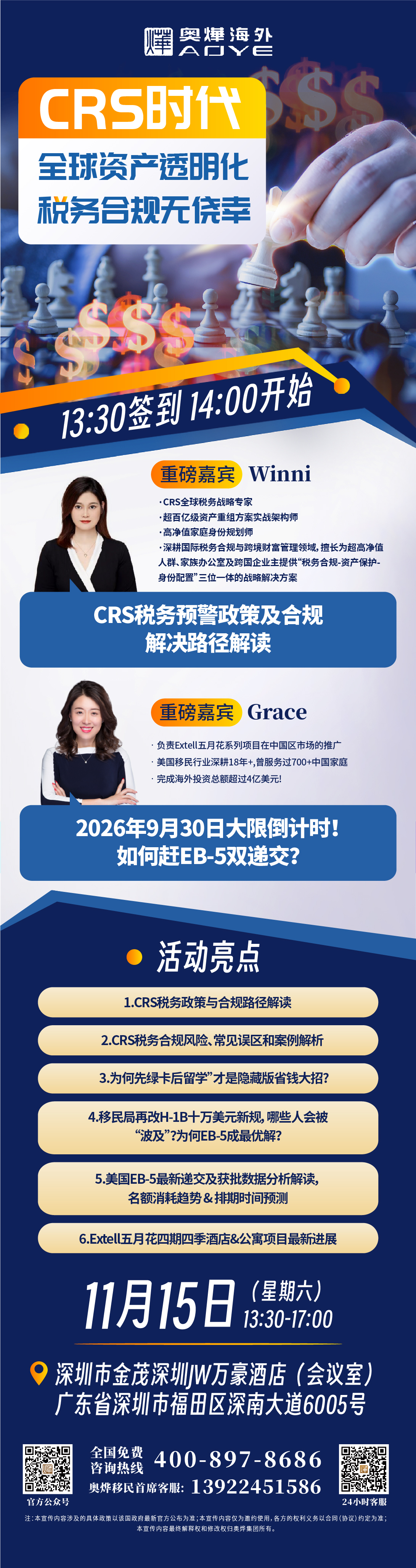 2、11月15日(星期六)特邀CRS全球税务战略专家和资深美国移民专家坐镇分享,为您和家人深度解读CRS税务预警政策及合规解决路径,还有EB-5大限倒计时特别指南!