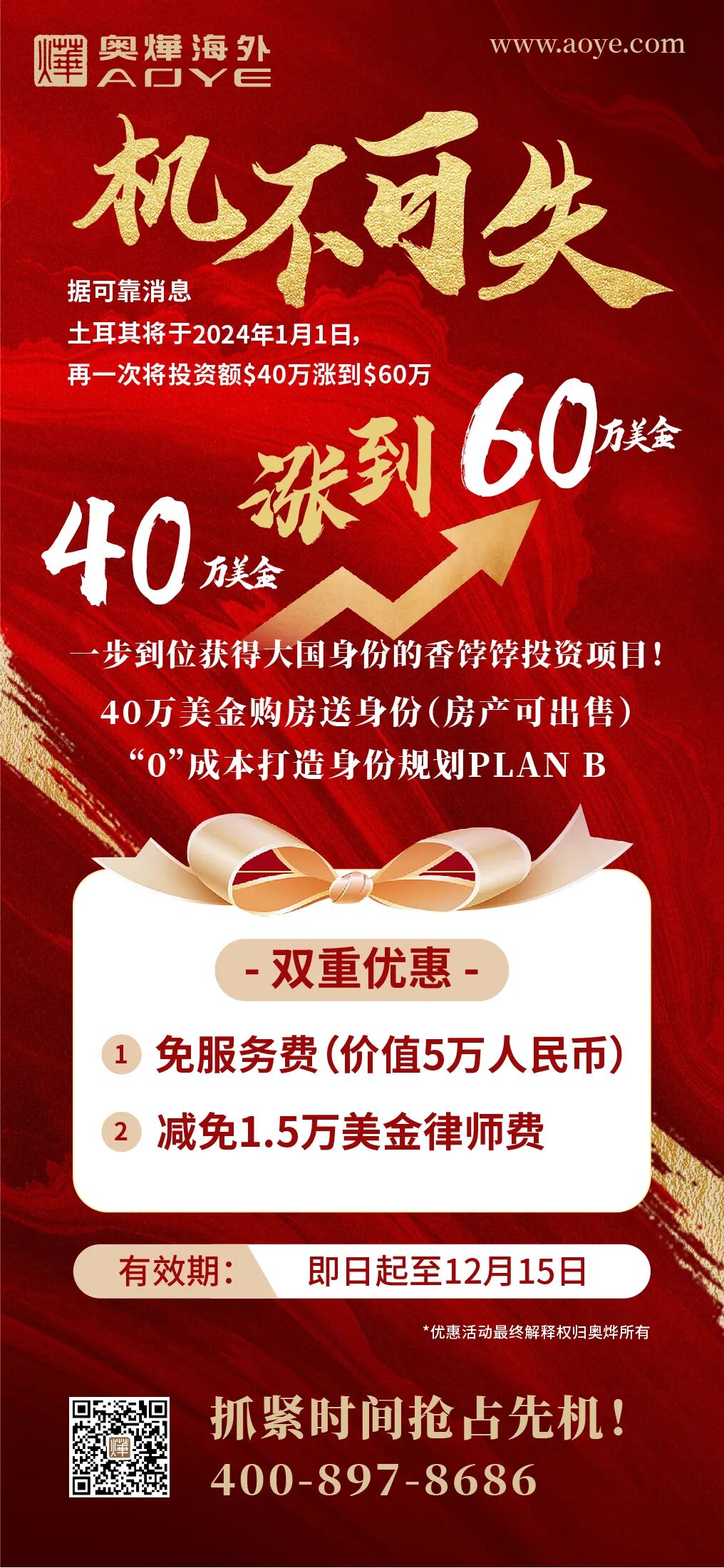 今天一早,土耳其律所传来消息,称将于2024年,土耳其投资入籍投资额将从40万美金涨到60万美金或更高。