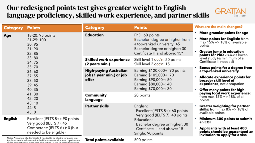 由于现行制度的不足,包括对英语水平、高学历、专业技能和配偶技能分值过低,加分项目过多等。Grattan提出的新的打分制彻底改变了原来的评分标准,总分变为500分。300分为EOI的最低标准,400分以上保准获邀。