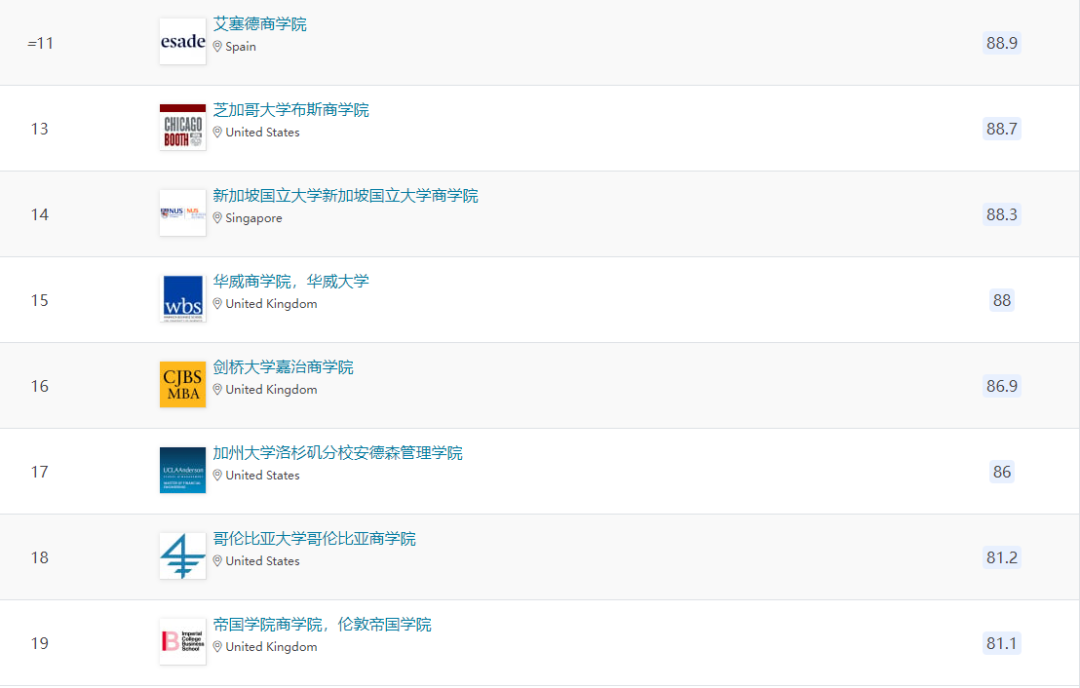 美国此次共有11所商学院进入全球前20,42所商学院进入全球前100;