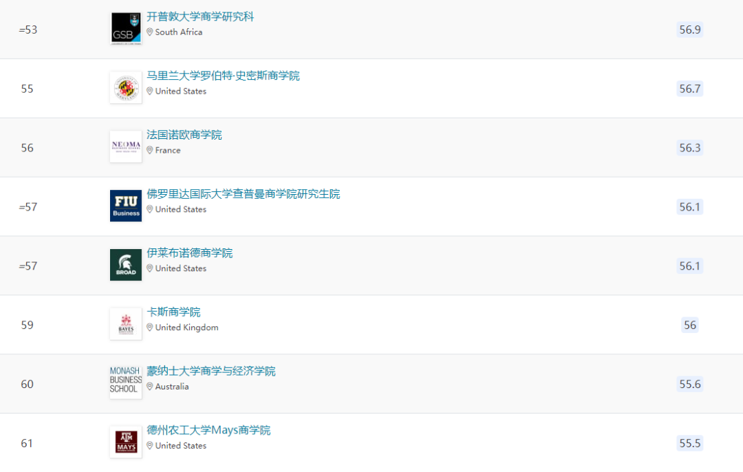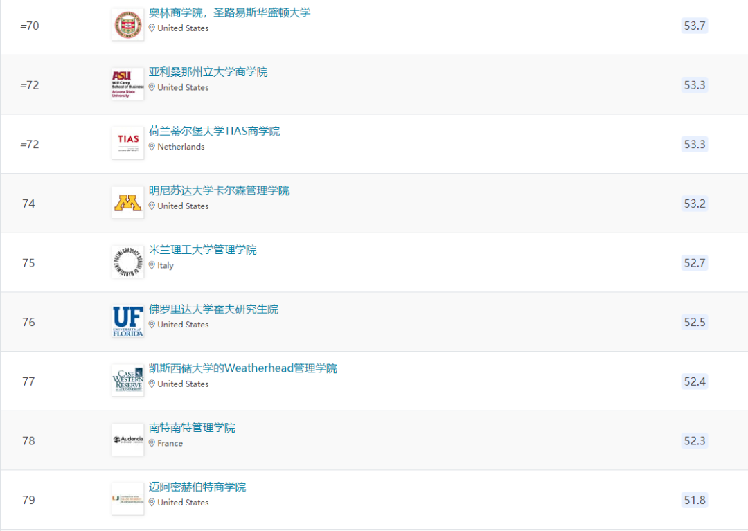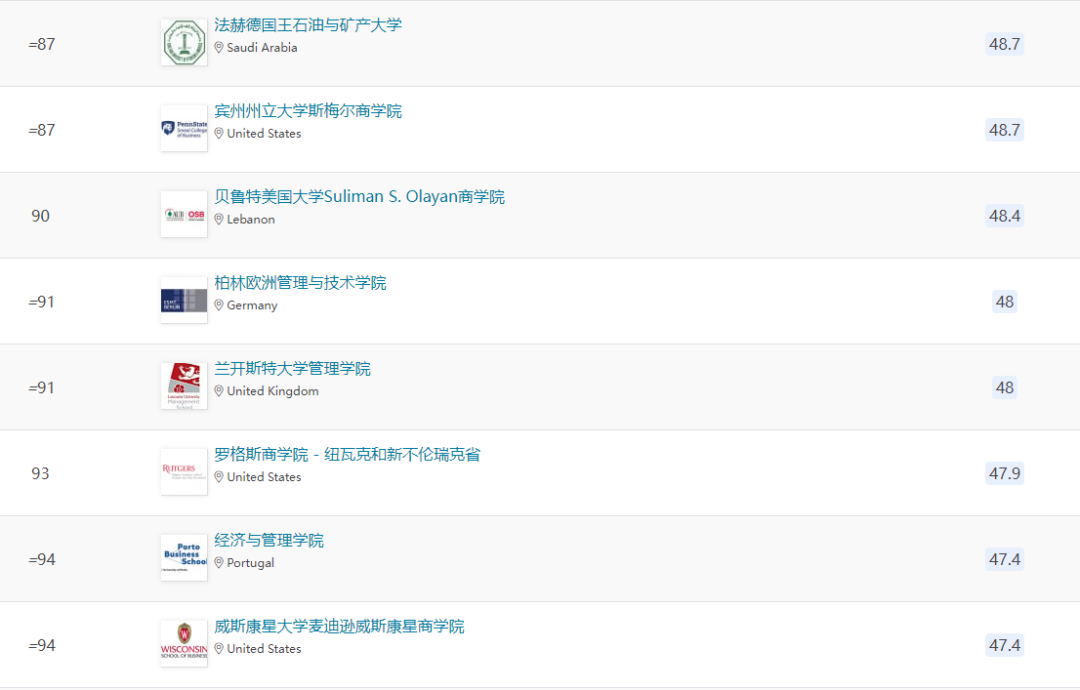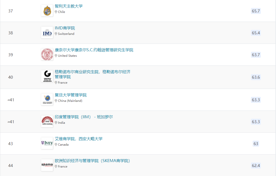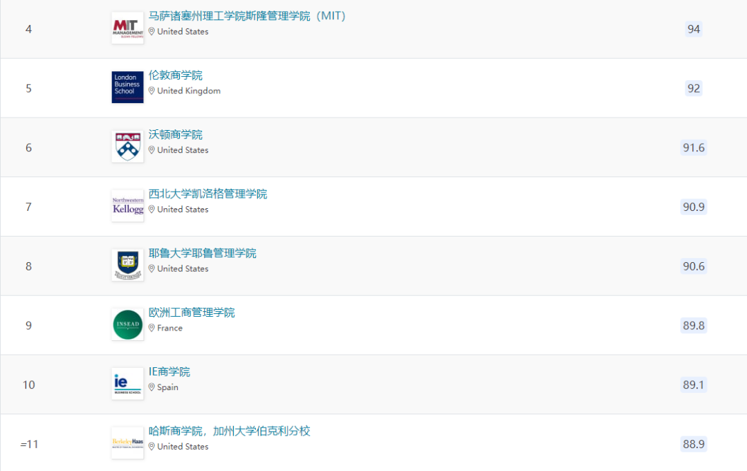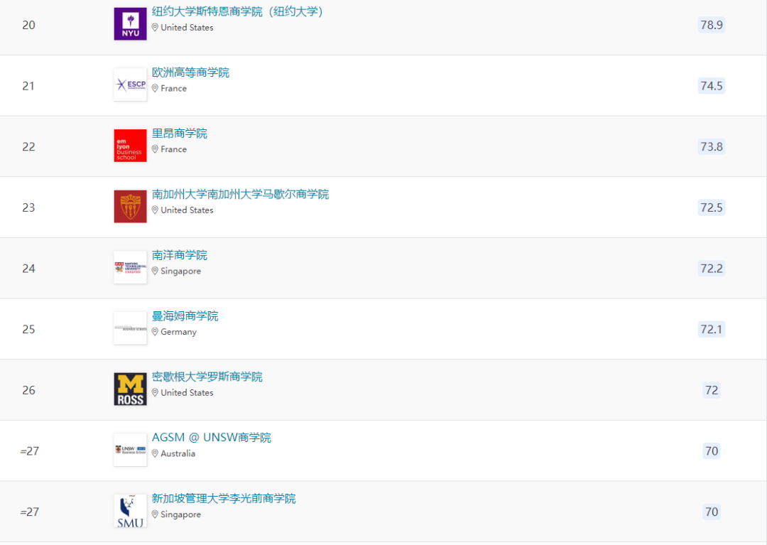 除上述商学院外,欧洲还有24所商学院进入全球前一百。