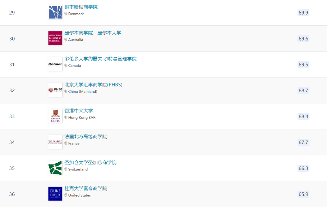 中国香港此次有4所商学院上榜,进入全球前一百的商学院来自:香港大学(全球第35)、香港科技大学(全球第46)香,港中文大学(全球第76)。