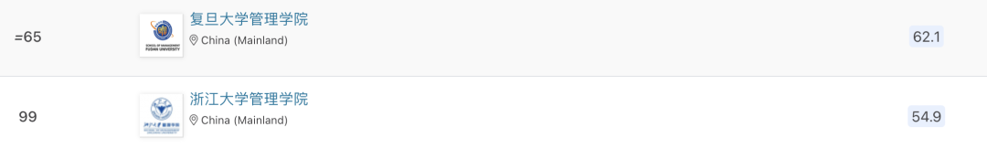中国内地入榜的10所商学院中有5所进入前一百,分别是清华大学(全球第28)、中欧国际商学院(全球第38)、上海交通大学安泰经济与管理学院(全球第62)、复旦大学管理学院(全球第65)、浙江大学管理学院(全球第99)。