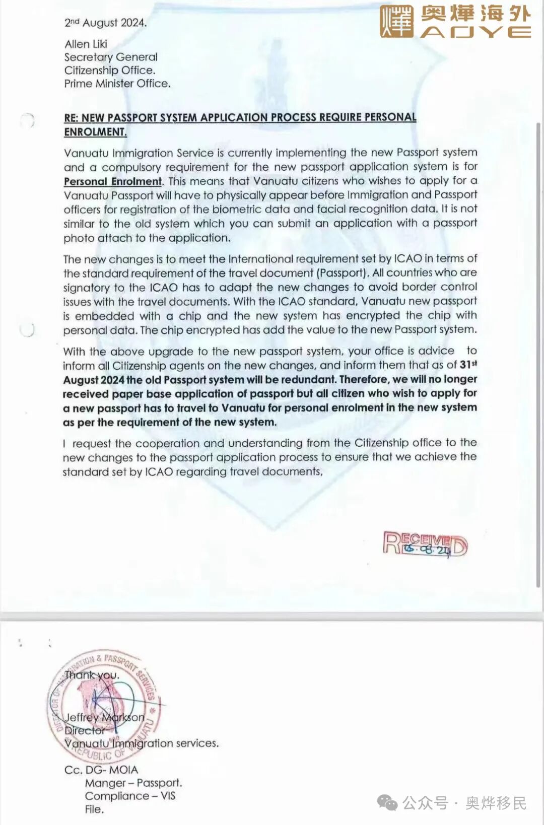 自2024年9月1日起,瓦努阿图政府规定,新的Passport申请人,需要本人亲自入境,采集指纹生物信息。