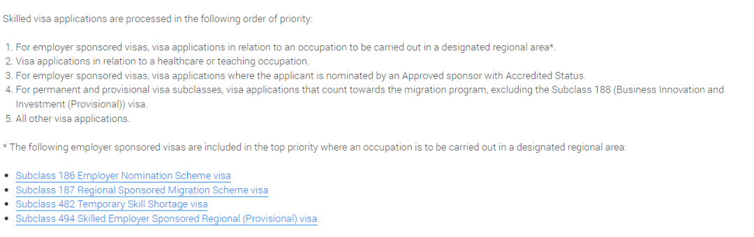 1、针对雇主担保类签证:若申请人在指定区域内从事提名职业,将获最高审理优先级,包括186,187,482和494签证类别;