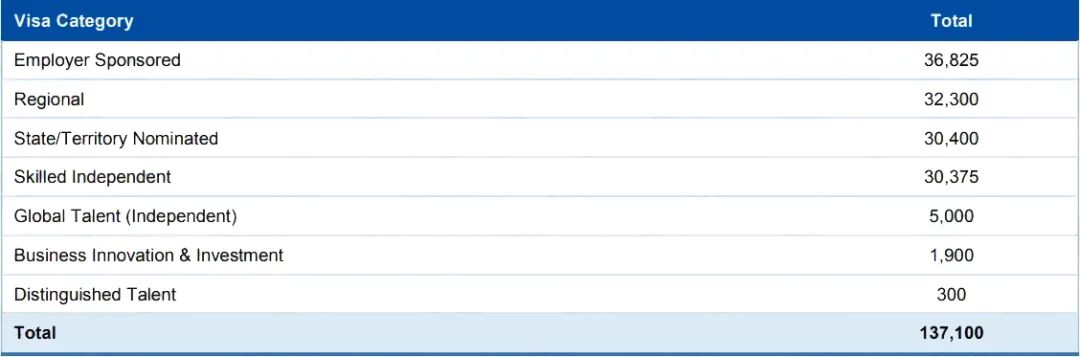 在137,100份技术移民签证中,各类别的签证分布如下: