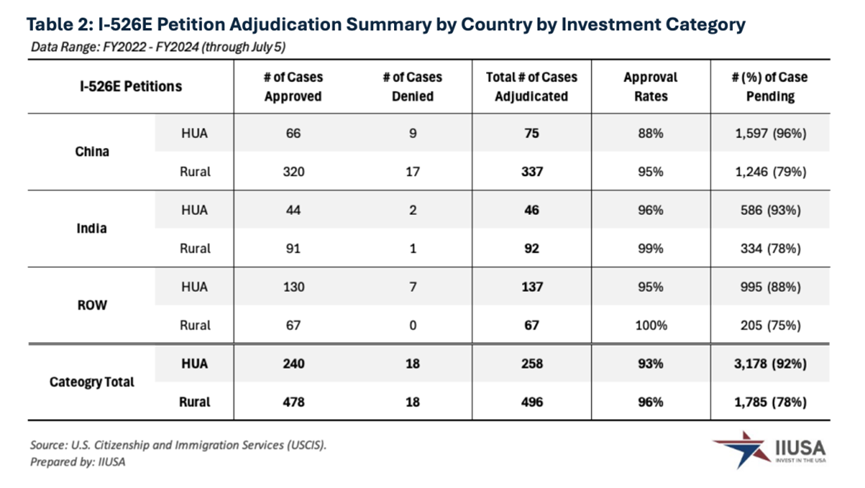 乡村地区:中国申请人有320个I-526E申请获得批准,17个被拒绝,拒签率5%,获批率高达95%,有79%的申请正在审理中。