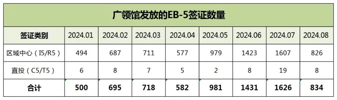2024年8月份,广领馆共计发放EB-5签证834张。