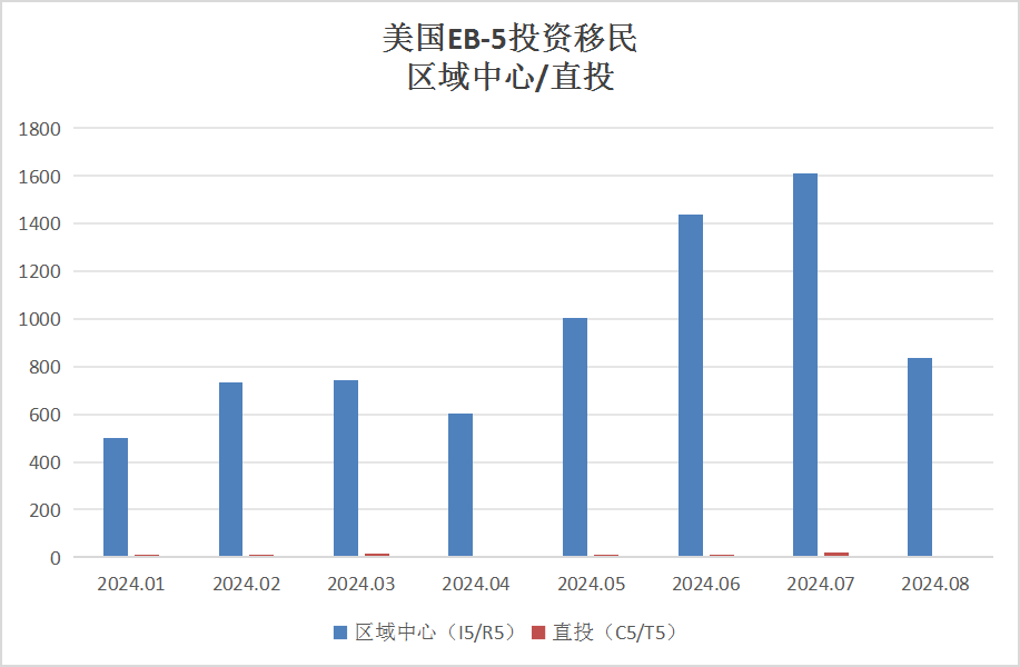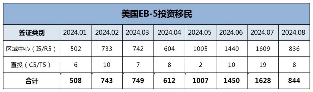 2024年8月份,全球各地中国投资人获得的EB-5签证共计844张,其中区域中心项目836张,直投项目8张。