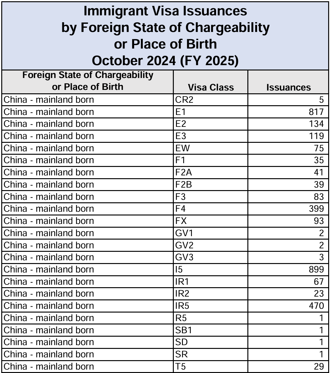 官网链接:https://travel.state.gov/content/dam/visas/Statistics/Immigrant-Statistics/MonthlyIVIssuances/OCTOBER%202024%20-%20IV%20Issuances%20by%20FSC%20or%20Place%20of%20Birth%20and%20Visa%20Class.pdf