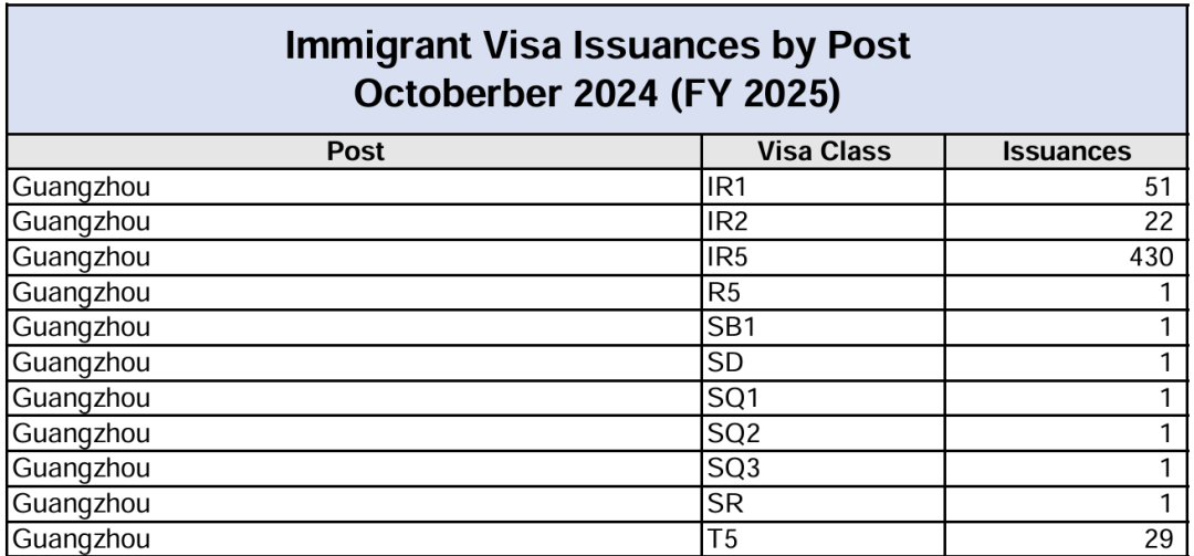 官网链接:https://travel.state.gov/content/dam/visas/Statistics/Immigrant-Statistics/MonthlyIVIssuances/OCTOBER%202024%20-%20IV%20Issuances%20by%20Post%20and%20Visa%20Class.pdf