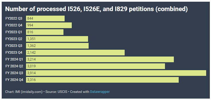 2024财年第四季度,递交I-526申请的投资者数量与相比第三季度增长了350%。第三季度的数据相对较低,主要是因为很多投资者赶在2024年4月1日政府费用调整之前提交申请。