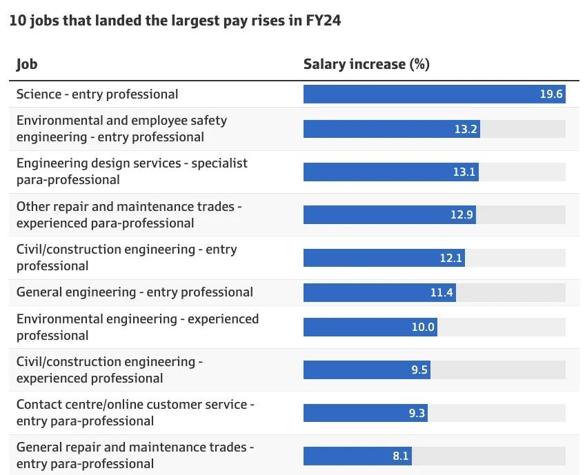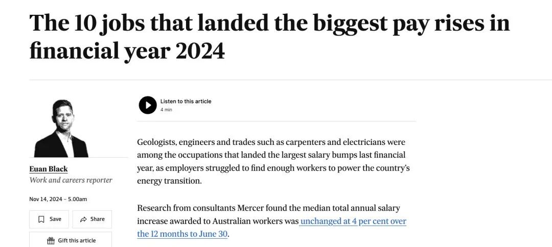 这些职业包括地质学家、工程师、木匠和电工等,也是上财年工资涨幅最大的职业之一。咨询公司美世(Mercer)的研究发现,去年澳洲人的年薪中位数涨幅为4%!