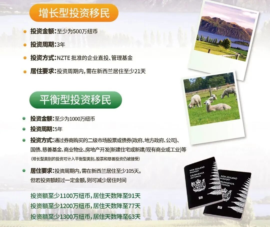 2、平衡型类别投资期内需居住105天,若投资金额超过1000万纽币,可相应减少居住时间。