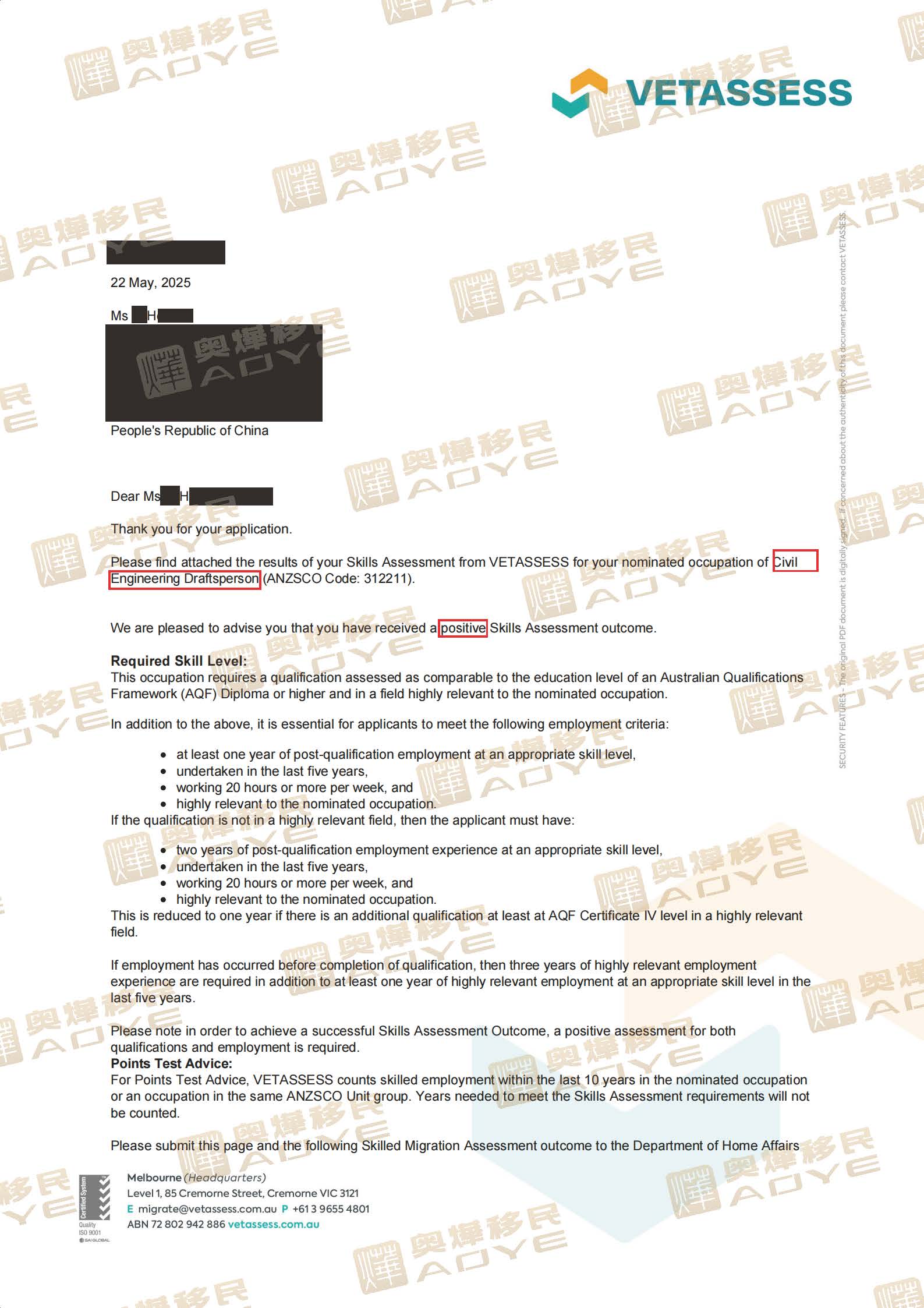 喜讯:186H女士通过职业评估,提名职位:土木工程绘图员