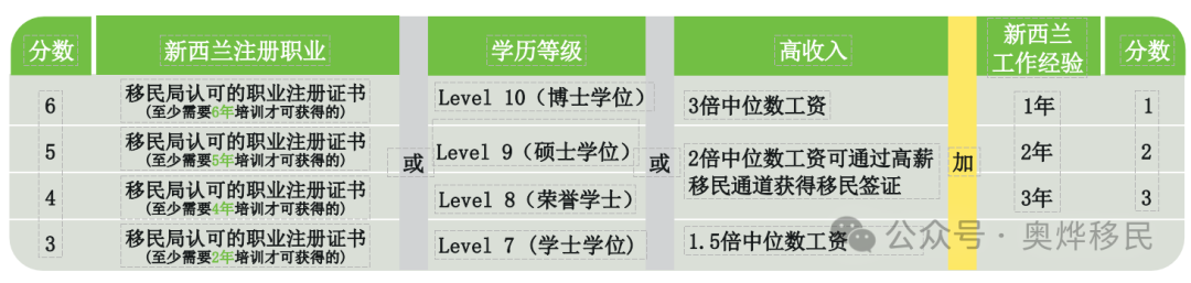 e.评分制度:满足“六分制”标准——这六分的组成来源于注册职业培训、学历、收入(三选一)加上新西兰本地技能工作。