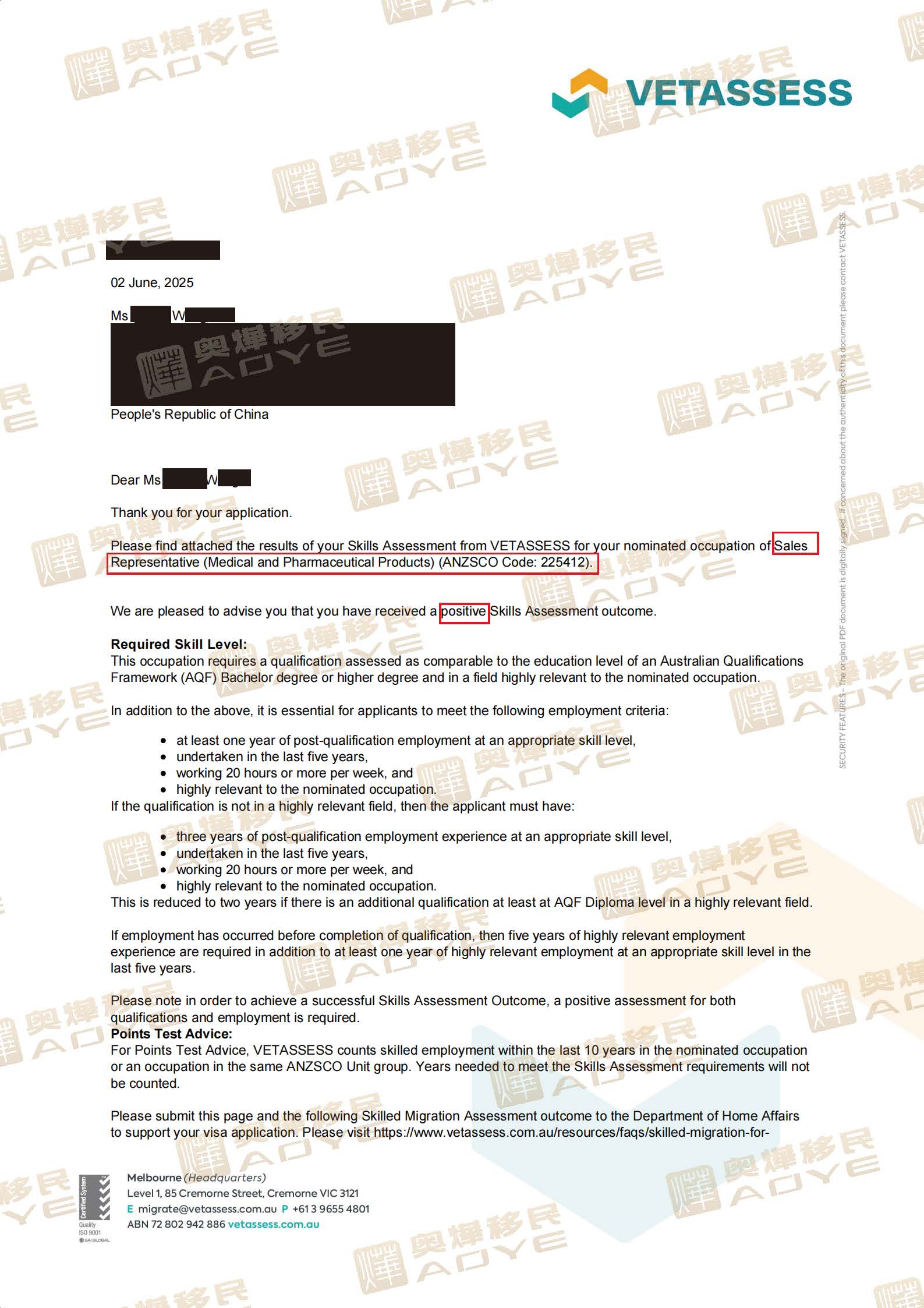 喜讯:186W女士通过职业评估,提名职位:销售代表(医疗和医药产品 ),5月28日递交(快速通道),6月2日职评通过。
