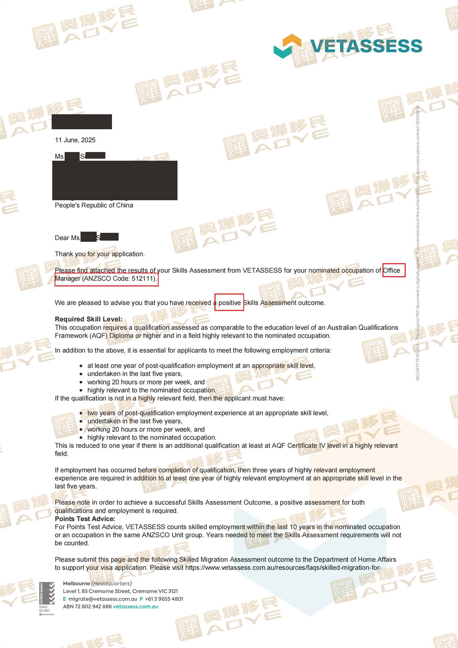 1. S女士,提名职位:办公室经理,4月30日递交学历认证;6月5日递交职业评估;6月10日学历认证完成;6月11日职业评估通过;