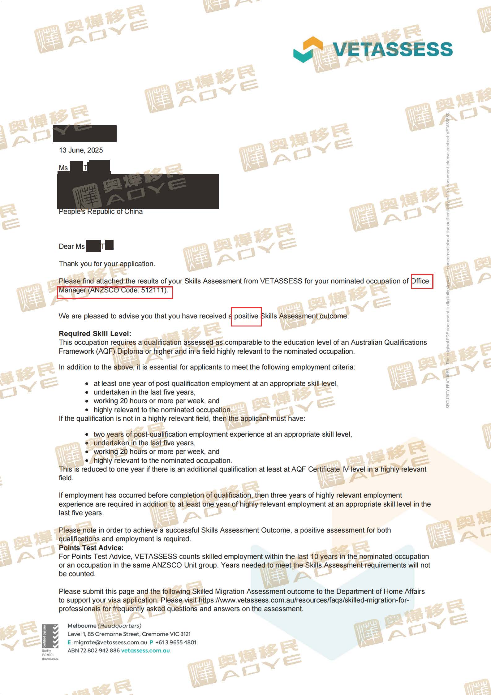 3. T女士,提名职位:办公室经理,4月21日递交学历认证;6月10日递交职业评估;6月13日同天完成学历认证并通过职业评估。