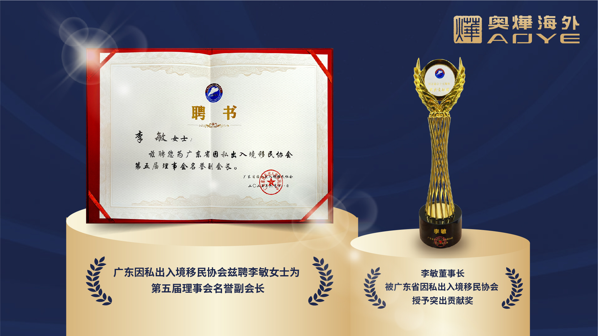 2025年6月20日,广东省因私出入境移民协会发起人之一兼名誉副会长,广州市奥烨移民服务有限公司创始人、董事长李敏作为移民机构的优秀代表,被广东省因私出入境移民协会授予“建会十五周年突出贡献个人”荣誉称号。