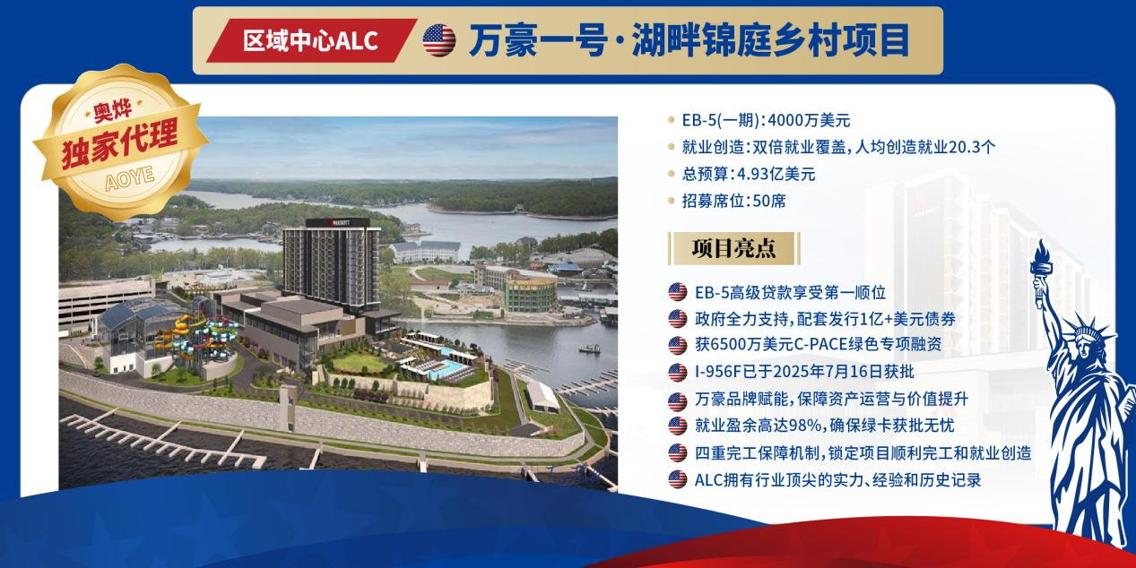 ①万豪一号·湖畔锦庭由信誉卓著的区域中心ALC打造,全球领先的万豪国际酒店集团运营,是获6500万美元C-PACE绿色专项融资项目。项目位于密苏里州奥赛奇沙滩市(0sage Beach),坐落于奥扎克湖(Lake ofthe Ozarks)湖畔,占地23.5英亩。项目预计为每位投资人创造20.3个就业,超过移民局10个就业的要求。I-956F已于2025年7月16日获批。拥有EB-5高级贷款享受第一顺位拥有六重资产抵押+开发商及实控人强担保。