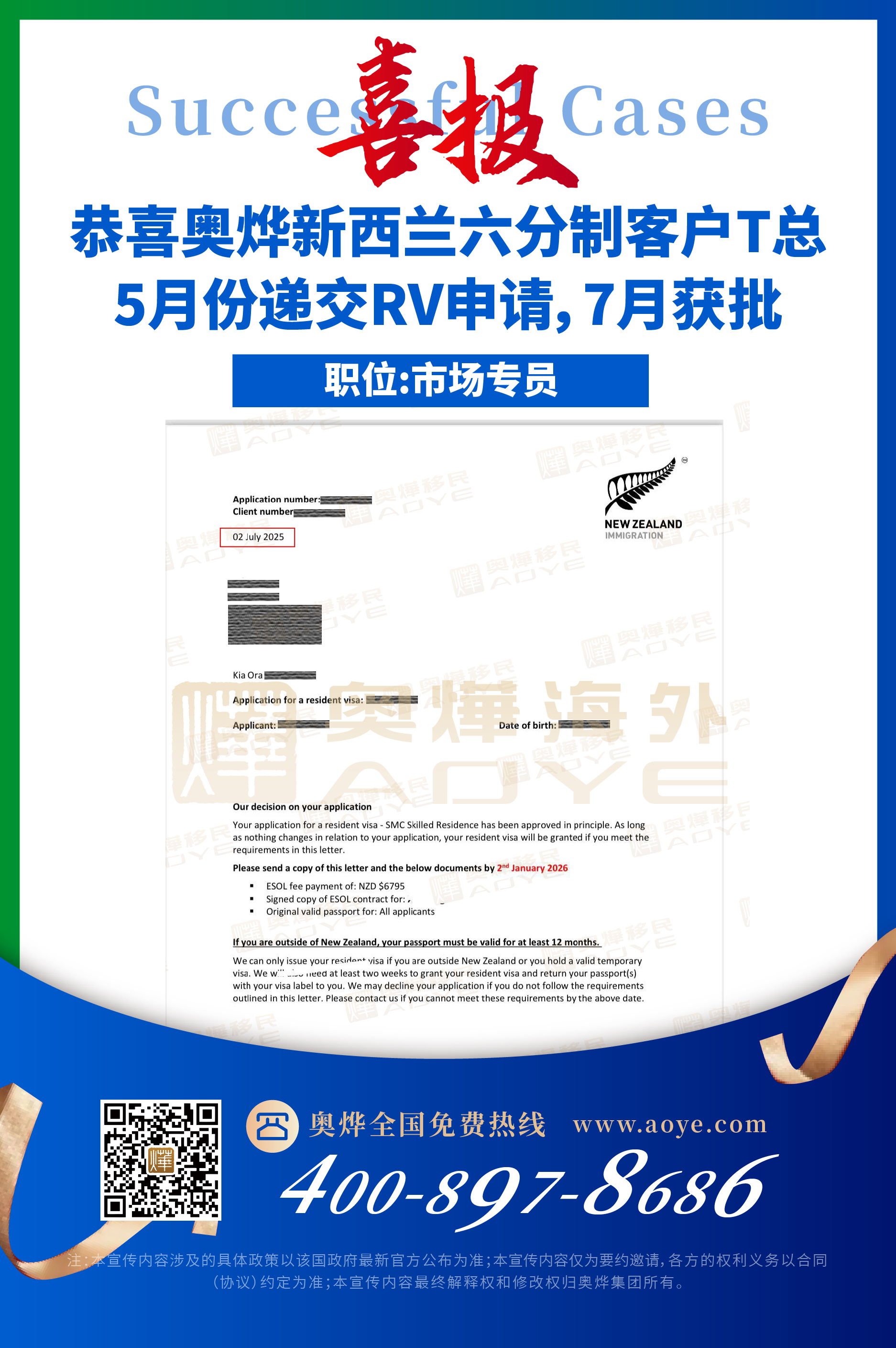 🎉🎉🎉恭喜奥烨新西兰六分制客户T总,快至3个月批复RV✅ 📌客户:T总 ➡年龄:37周岁 💻学历:硕士 📲申请职位:市场专员 🔥优先审理,仅花费3个月批复RV