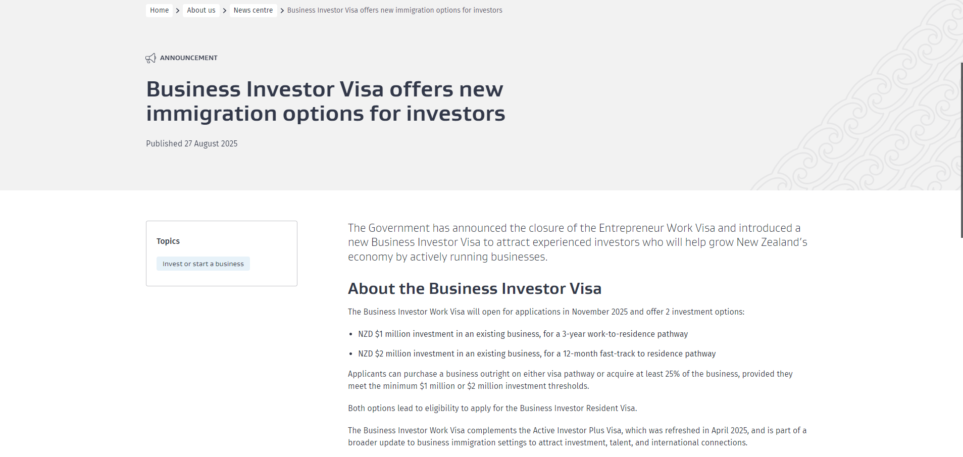 这一新政旨在吸引有资金实力和商业经验的海外投资者,通过投资现有企业推动新西兰经济发展,同时为投资者提供更清晰的居留路径。