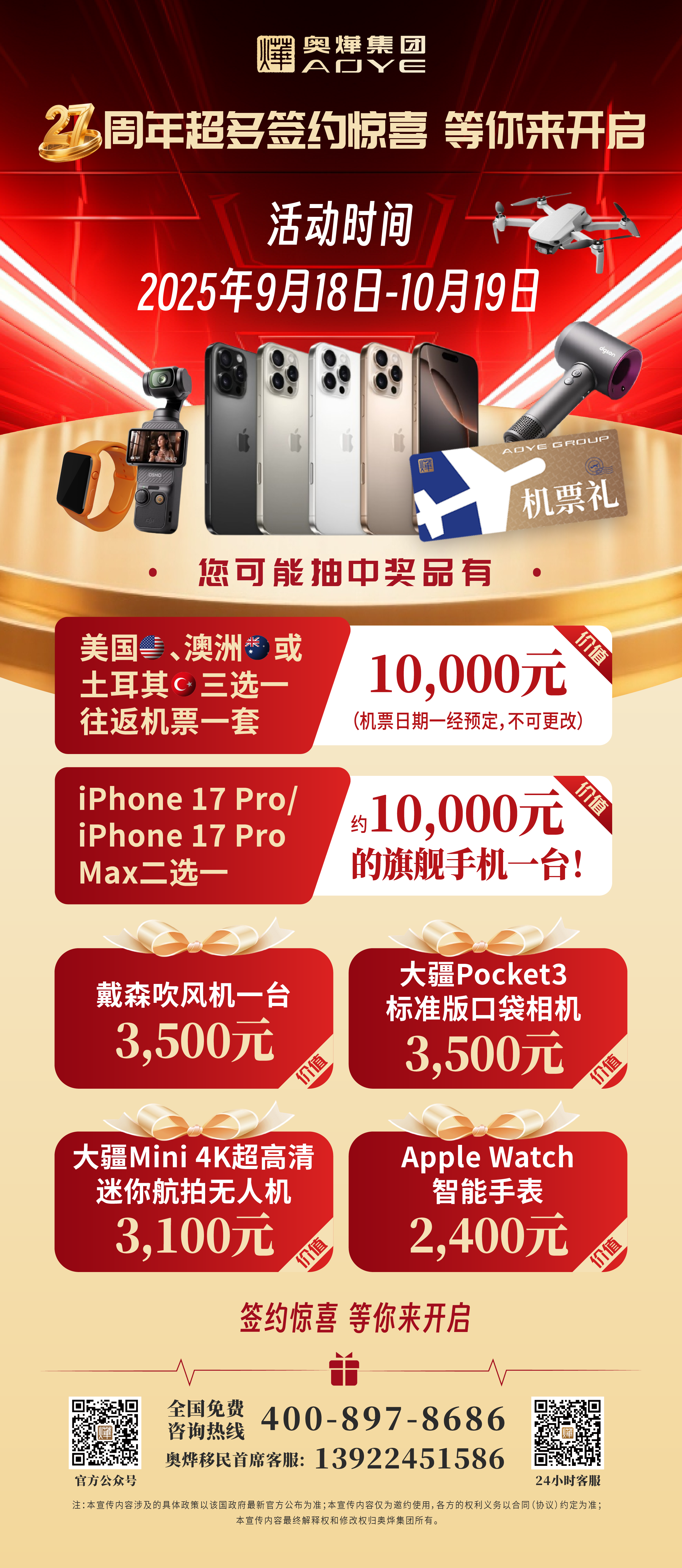 2025年9月18日至10月19日,签约特定移民项目,超值优惠大放送。不容错过的“美澳新欧加”绿卡与护照分享盛典,诚邀您的参与,抓住机遇,即刻行动,办理从速!