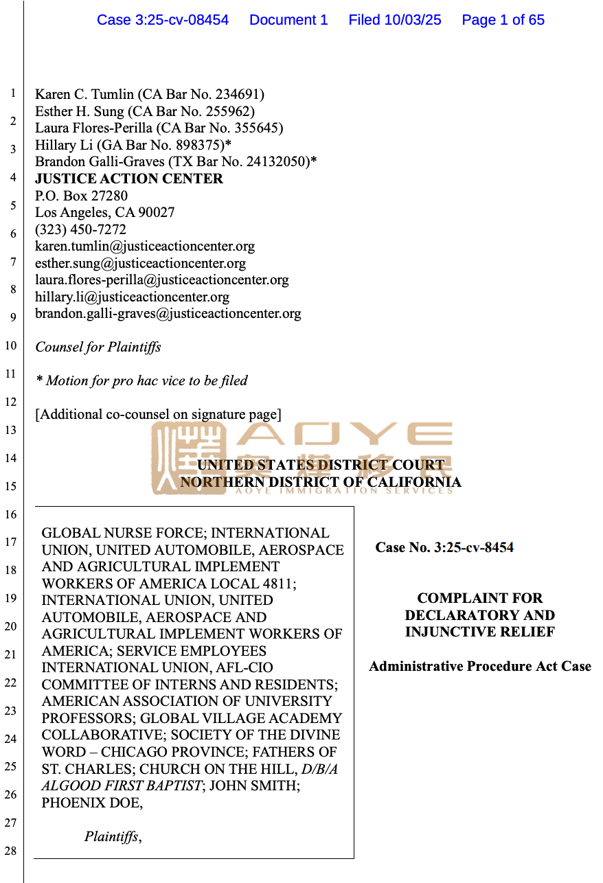 10月3日,一个由工会、医疗机构、高校专业人士及移民权益组织组成的强大联盟,正式将川普政府告上法庭。