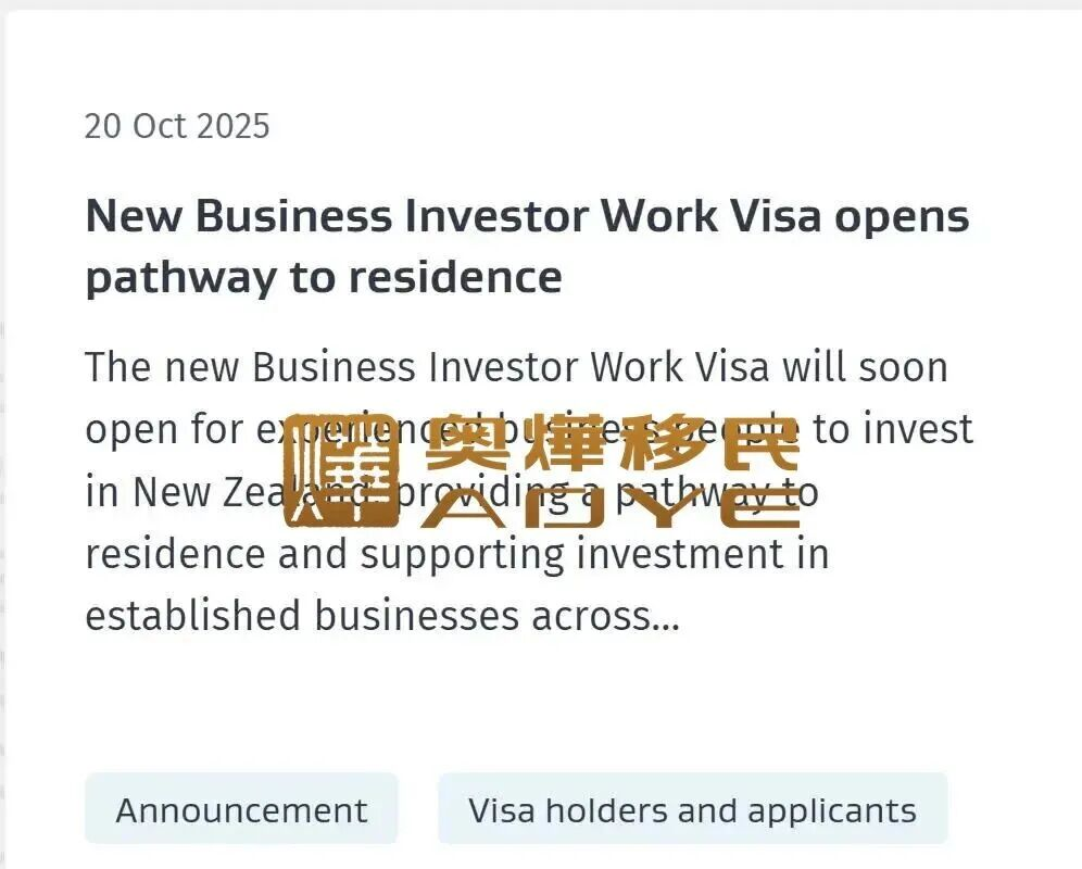 官网链接:https://www.immigration.govt.nz/about-us/news-centre/new-business-investor-visa-opens-pathway-to-residence/