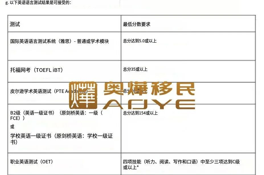英语语言考试成绩 —— 提交移民局认可的英语测试结果如下图: