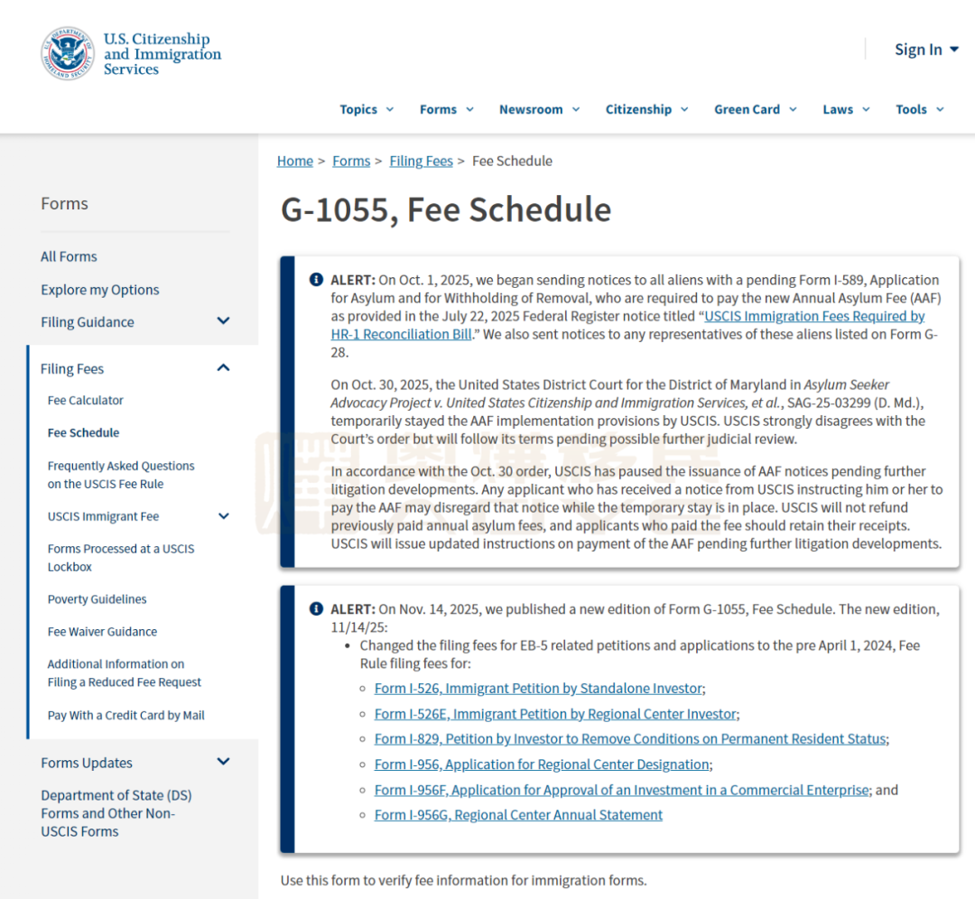虽然移民局还没发布正式新闻公告,但已经在官网费用总表G-1055(Fee Schedule)中进行了修订,明确标注EB-5表格申请费已改回2024年4月1日前的旧收费标准。