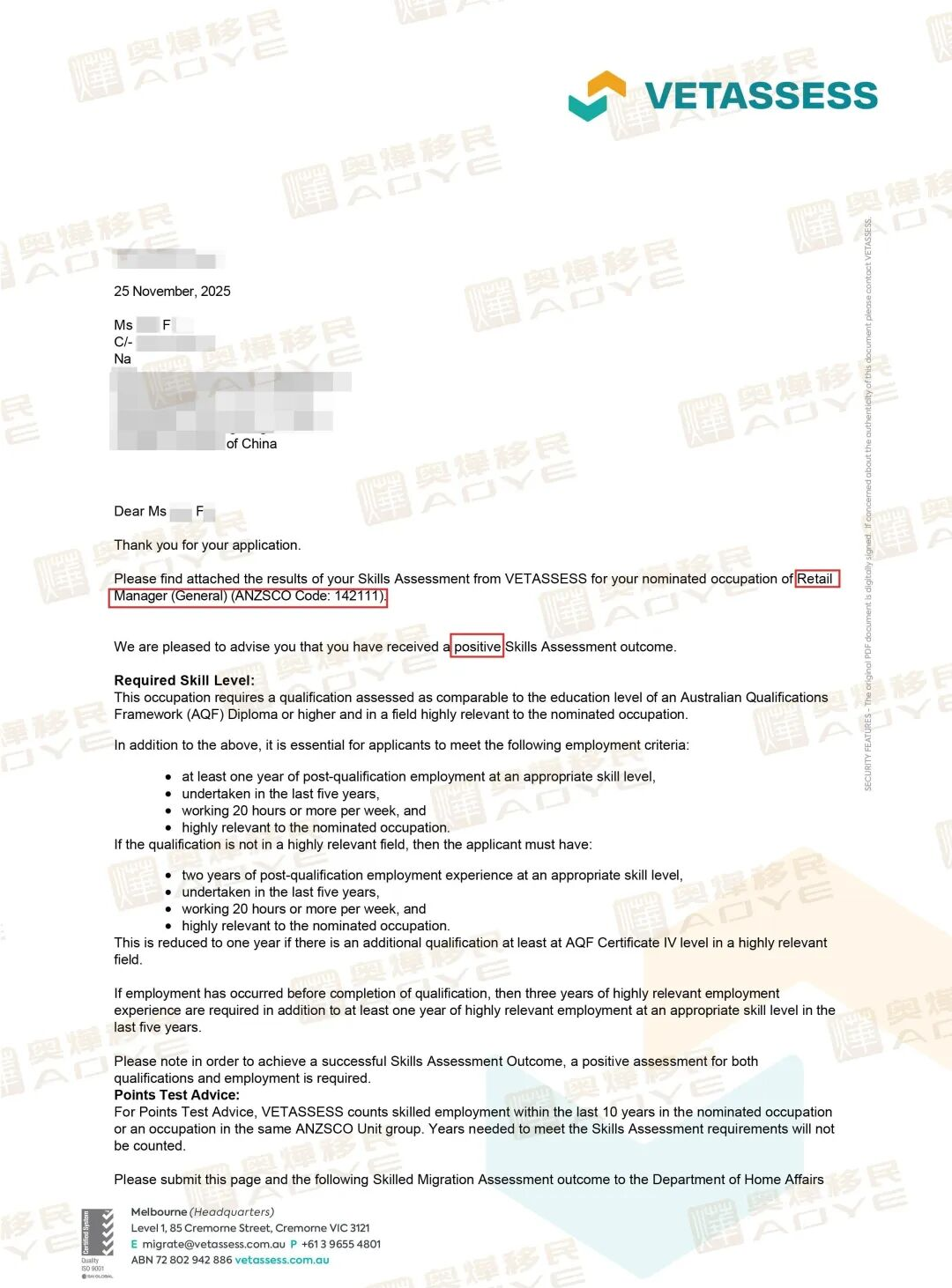 恭喜奥烨澳洲186客户F总成功通过零售经理职业评估