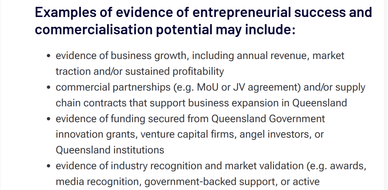 已在昆士兰州建立或正崭露头角的企业主/创业者,准备将一项创新性的产品或服务推向市场或进行扩展,且具备至少100万澳币的最低投资门槛。
