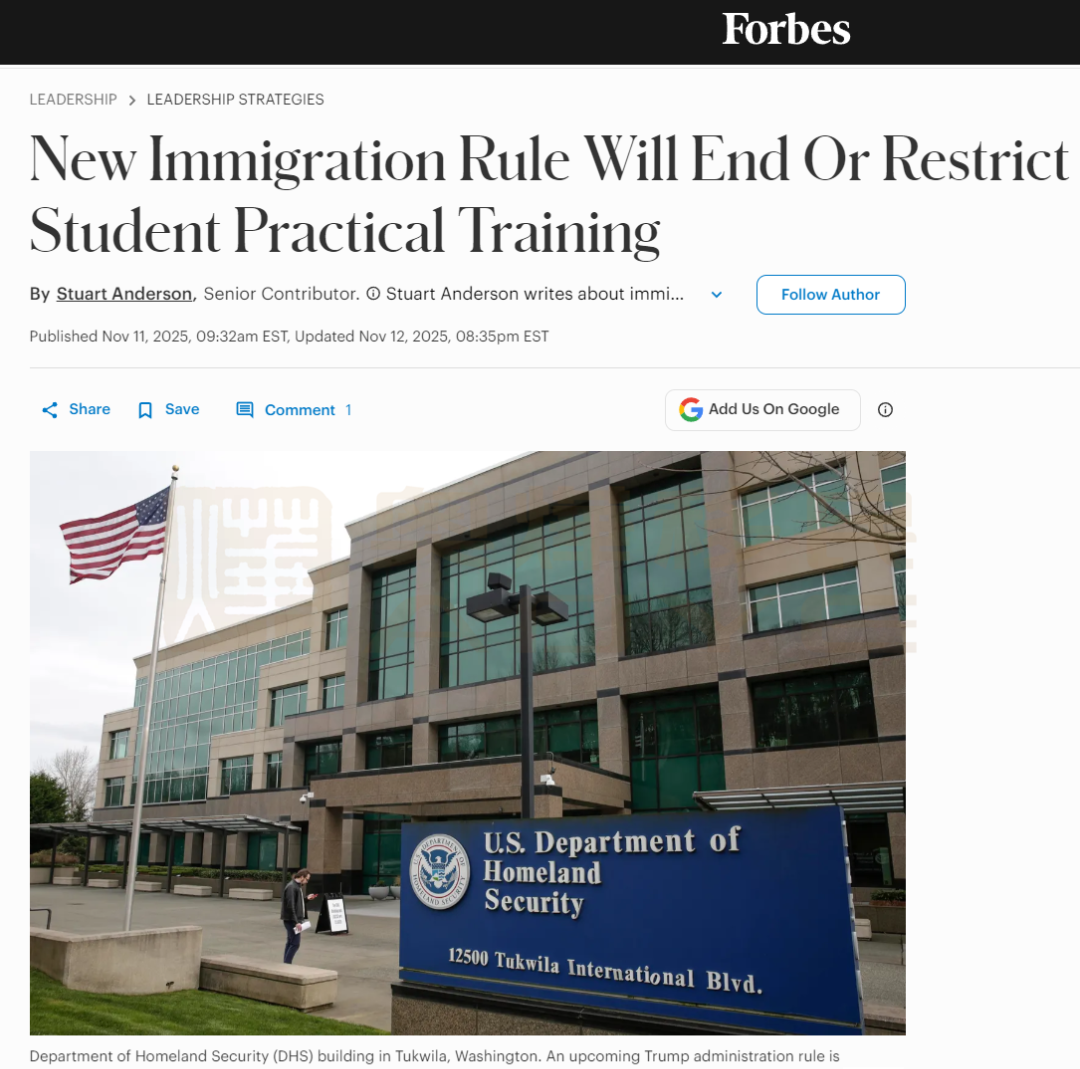 官网截图:https://www.forbes.com/sites/stuartanderson/2025/11/11/new-immigration-rule-will-end-or-restrict-student-practical-training/?ctpv=searchpage