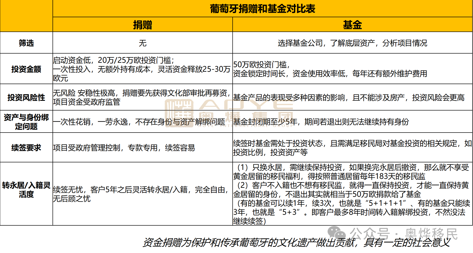 众所周知,葡萄牙50万欧基金与25万欧捐款是葡萄牙黄金签证的两种主流方式,以下是深度对比。