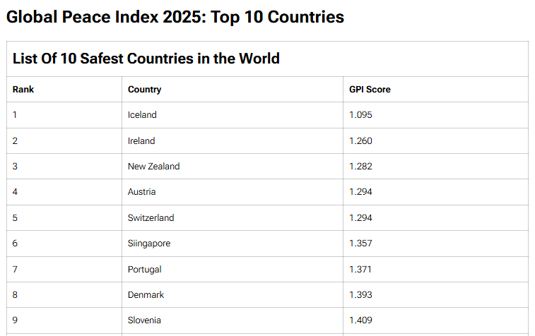 根据2025年《全球和平指数》最新排名,全球最安全的10个国家依次为:冰岛、爱尔兰、新西兰、奥地利、瑞士、新加坡、葡萄牙、丹麦、斯洛文尼亚、芬兰。