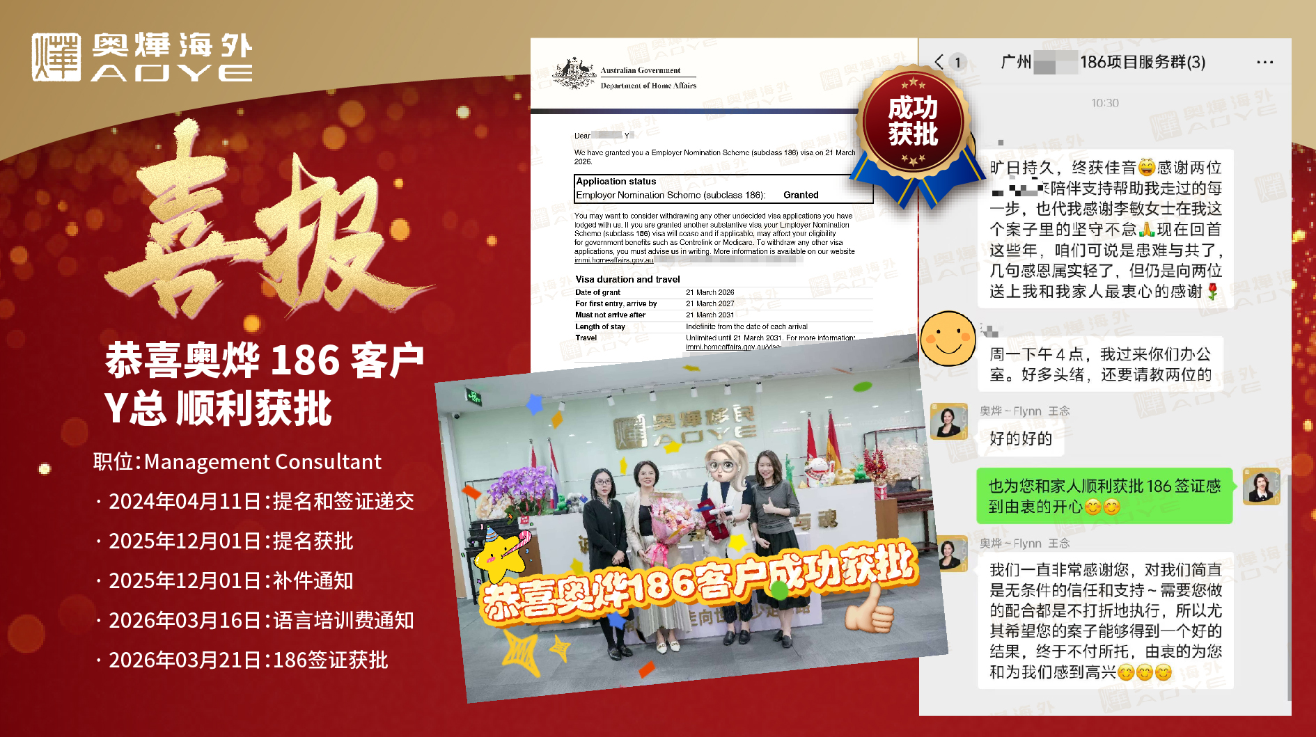 广州,2026 年 3 月 21 日 —— 近日,奥烨移民(奥烨海外)再传重磅捷报:由我司全程操盘的澳洲 186 雇主担保签证(Employer Nomination Scheme, 子类别 186)申请项目圆满收官,客户 Y 总成功获批澳洲永久居留权,为奥烨移民在大龄申请人移民赛道上再添一座实力里程碑。