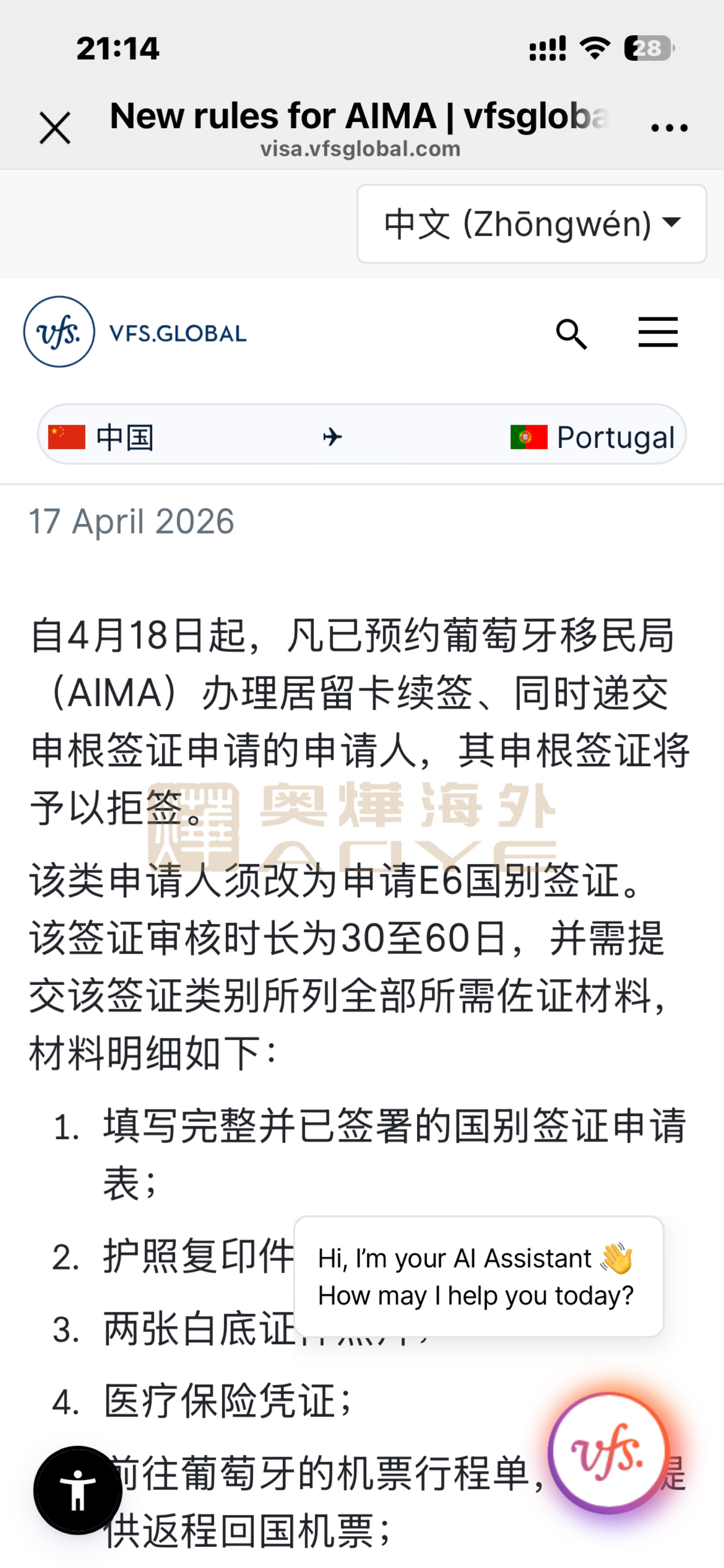 葡萄牙融合、移民与庇护事务局(AIMA)于2026 年 4 月 17 日发布官方公告,自 2026 年 4 月 18 日起,对已预约 AIMA 办理居留续签的外国公民实施签证申请新规:
