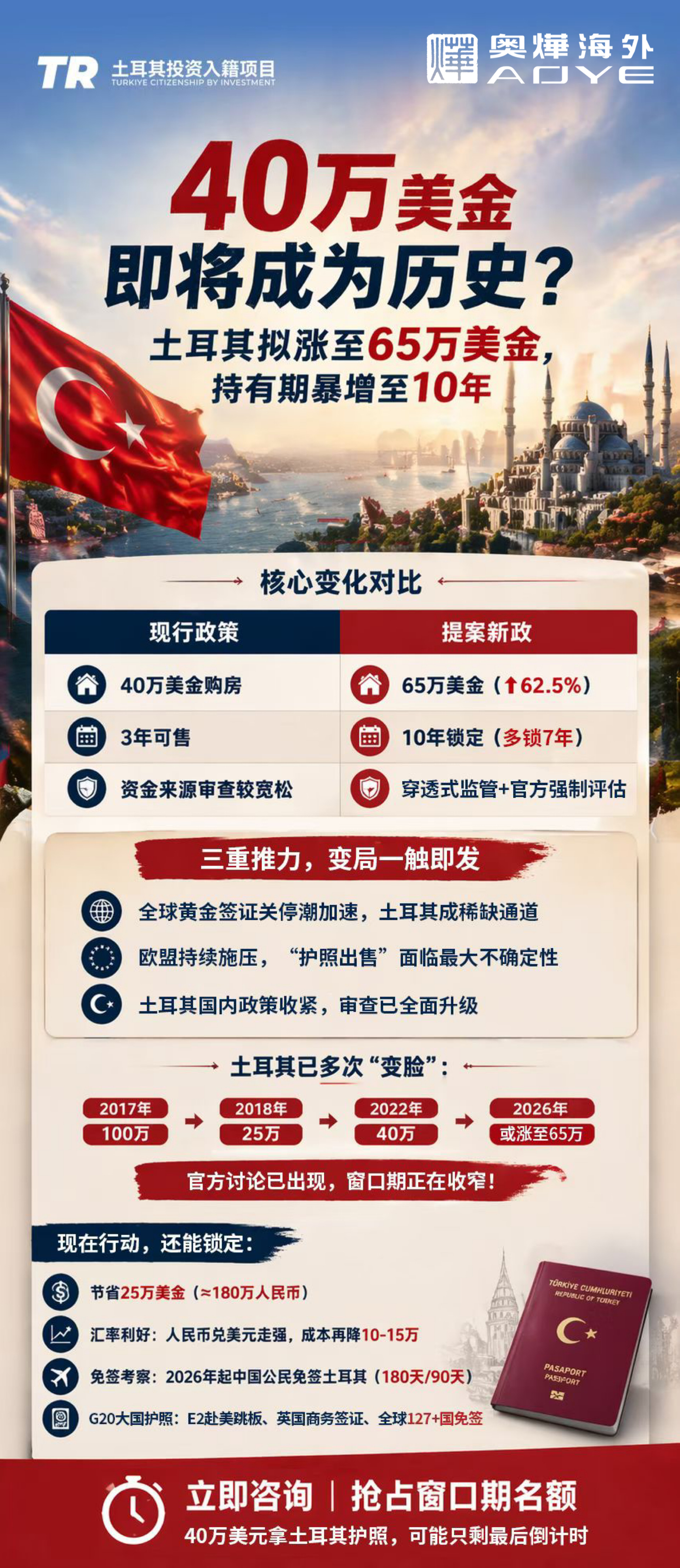 目前新政尚未正式官宣,但政策调整信号已十分明确,40 万美金购房入籍的黄金窗口期正在快速收窄。一旦新政落地,所有延后申请者将直接按照 65 万美金高标准执行,错过本次机会,后续再无低成本配置土耳其护照的可能。