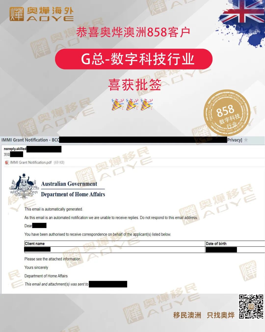 【奥烨捷报】祝贺澳洲858客户数字科技行业G总,喜获批签