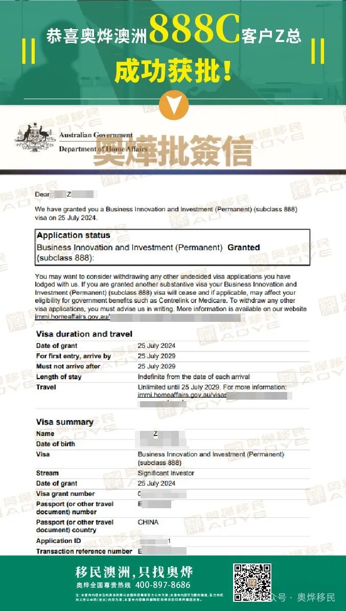 【奥烨捷报】祝贺澳洲888C客户Z总,成功获批