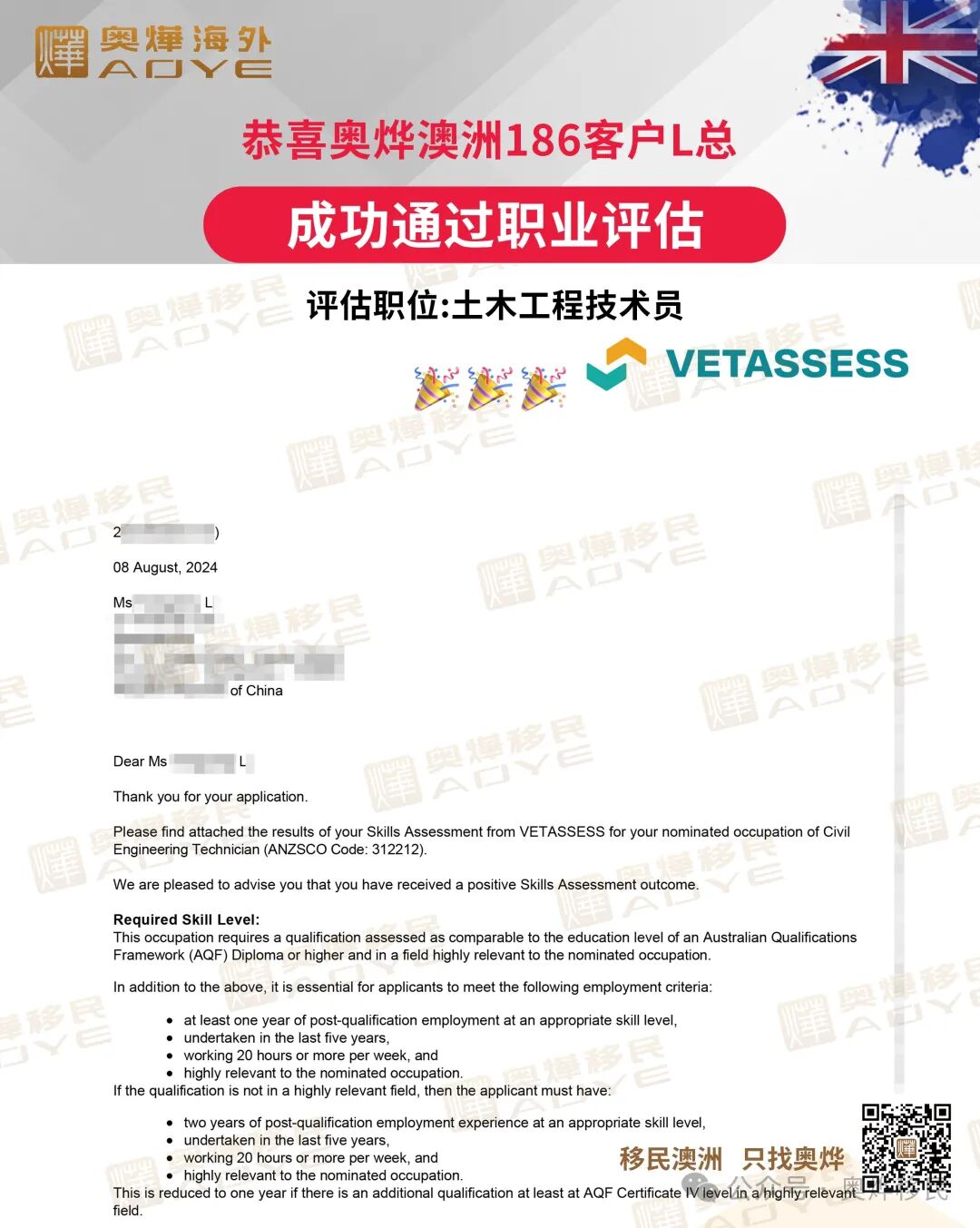 【奥烨捷报】祝贺澳洲186客户L总,成功通过职业评估