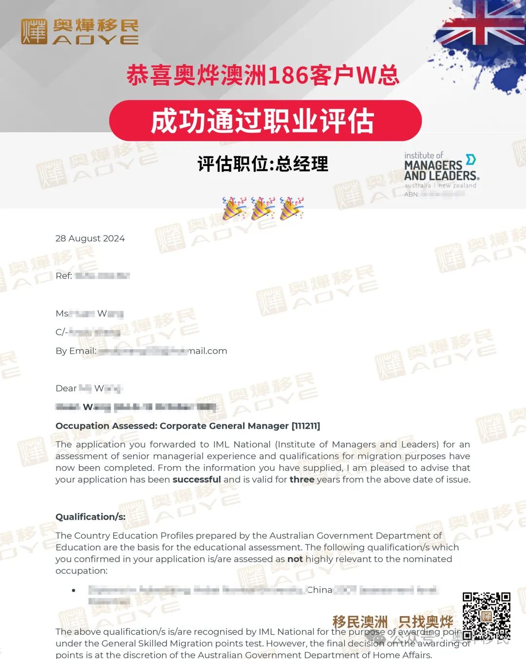 【奥烨捷报】祝贺澳洲186客户W总,成功通过职业评估