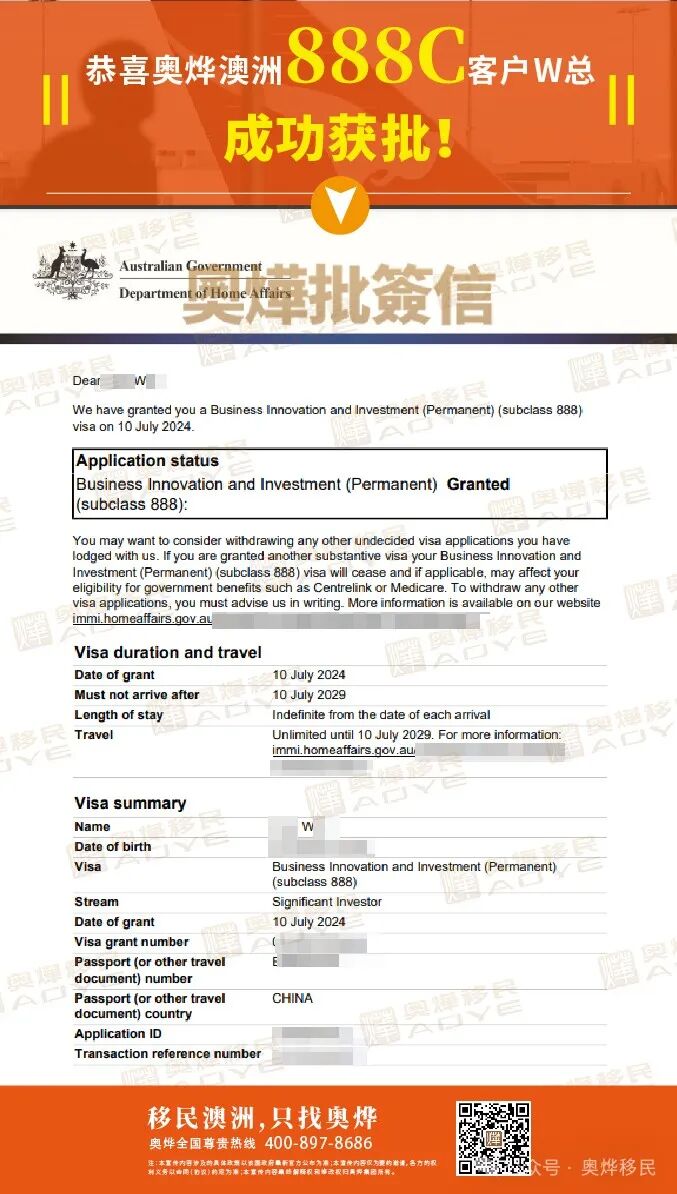 【奥烨捷报】祝贺澳洲888C客户W总,成功获批