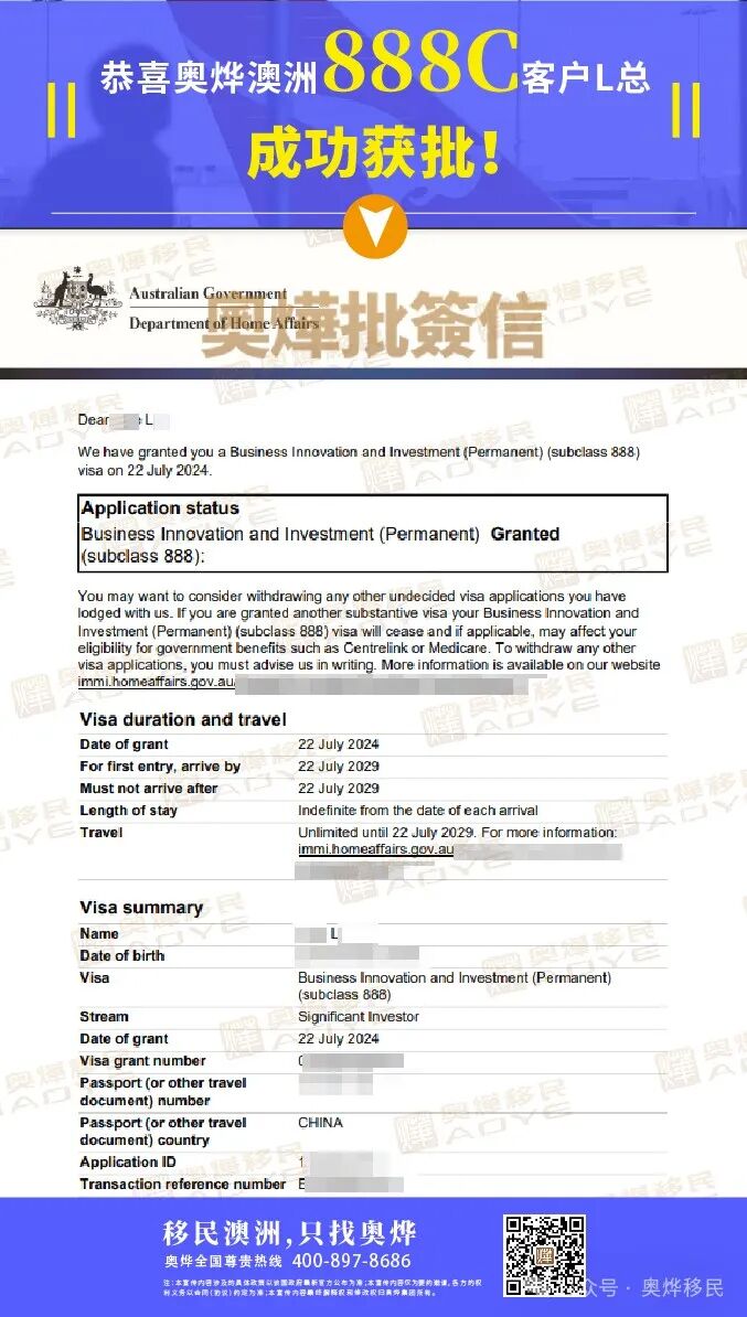 【奥烨捷报】祝贺澳洲888C客户L总,成功获批