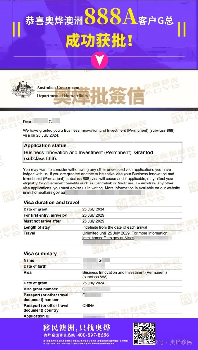 【奥烨捷报】祝贺澳洲888A客户G总,成功获批