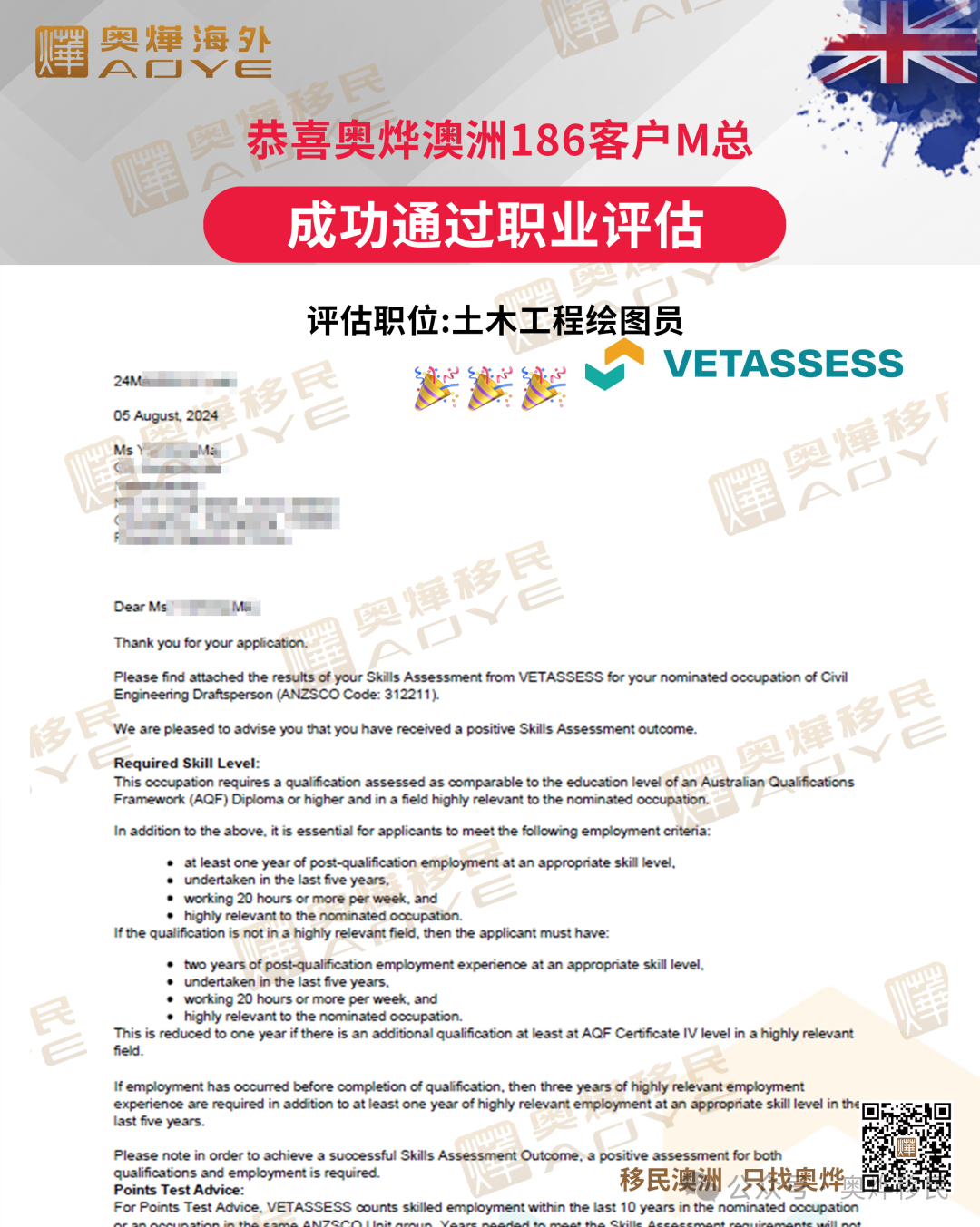 【奥烨捷报】祝贺澳洲186客户M总,成功通过职业评估