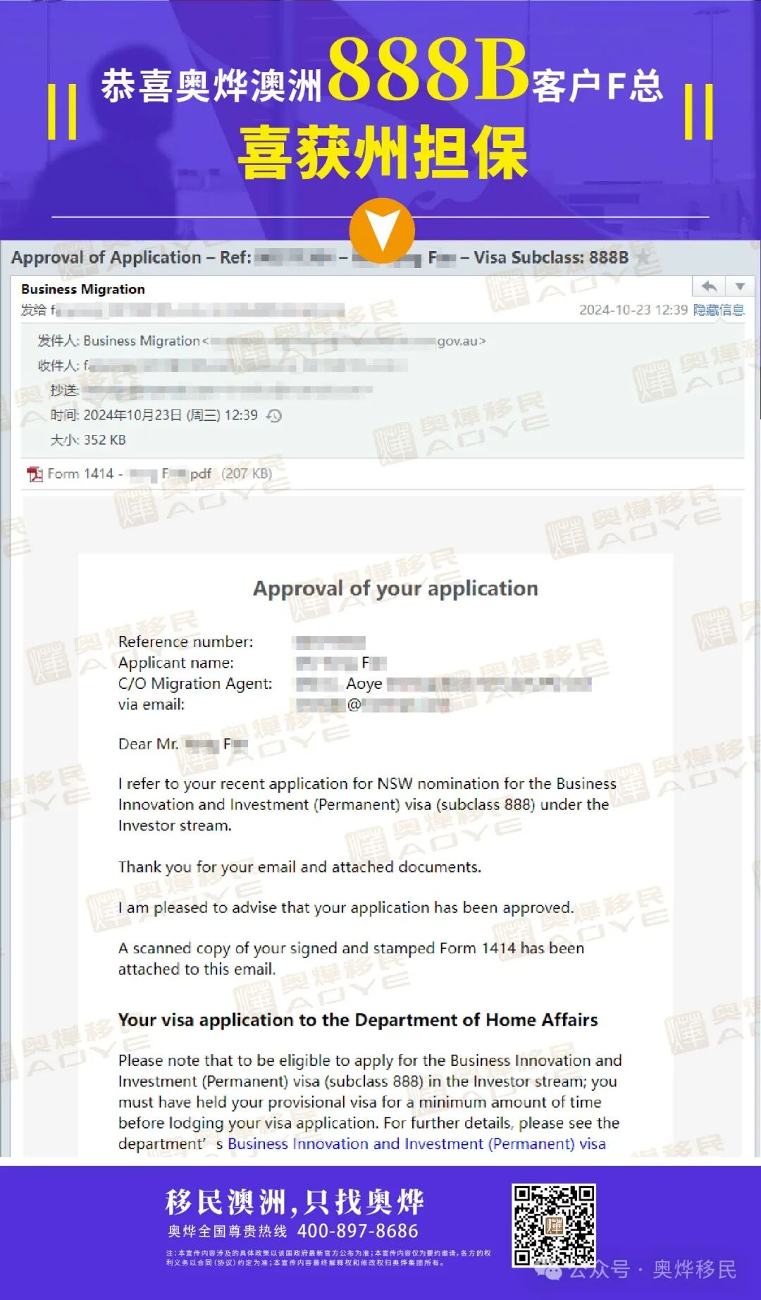 【奥烨捷报】祝贺澳洲888B客户F总,喜获州担保