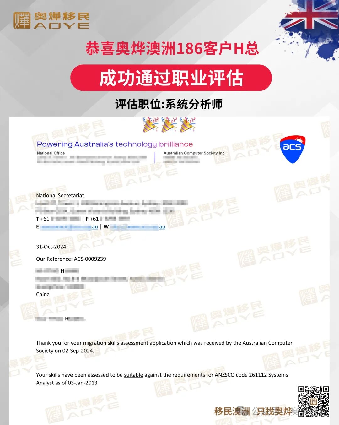 【奥烨捷报】祝贺澳洲186客户H总,成功通过职业评估
